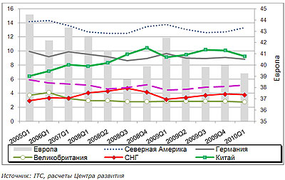 Однако обольщаться не стоит, так как сырьевой экспорт малоэластичен к спросу и снижение последнего ударило прежде всего по несырьевому экспорту (автомобили, оборудование и прочее) и по мере восстановления мировой торговли доля сырьевых стран в мировой торговле, к которым относится и большинство экономик СНГ, снова может снизиться. Все это актуализирует важность поиска российской экономикой своих конкурентных преимуществ, особенно имеющих несырьевую направленность, а также снятия многочисленных бюрократических препонов на пути развития эффективных проектов со стороны государства.