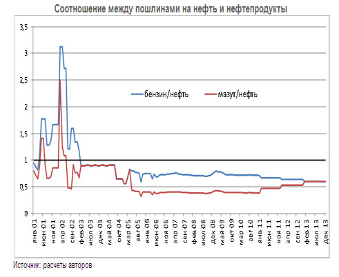 С мая 2005 года до января текущего года действовал налоговый режим, при котором пошлины на светлые нефтепродукты варьировались в диапазоне 70-80% от пошлины на сырую нефть, пошлины на топочный мазут – в диапазоне от 30 до 43%. Впрочем, вплоть до принятия постановления Правительства России от 27 декабря 2010 г. № 1155 никаких формальных соотношений не существовало - пошлины на нефтепродукты определялись отдельными решениями правительства.