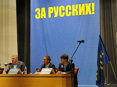 ЛДПР в этом отношении вела себя традиционно и никого не удивила. Она шла на выборы под лозунгом «Мы за русских. Русские - все», подразумевая под русскими всех, кто говорит на русском языке. Предтечей этого лозунга было «Мы за бедных, мы за русских» - предвыборный слоган ЛДПР в парламентской кампании 2003 года. Этот мотив с незначительными вариациями партия Жириновского включает на полную громкость во всех своих походах в федеральный и региональные парламенты.