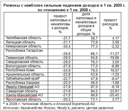 Согласно опубликованной на прошлой неделе отчетности за первый квартал 2009 г. общие доходы региональных бюджетов в номинальном выражении упали на 5,8% по сравнению с первым кварталом 2008 г., при этом падение собственных (налоговых и неналоговых) доходов в сумме составило 11,7%. Номинальное сокращение собственных доходов затронуло 59 регионов. В том числе в 15 субъектах федерации они сократились более чем на 20% по сравнению с тем же периодом 2008 г.