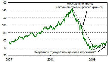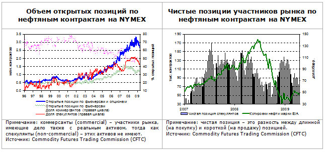Масштабные финансовые инъекции в мировой банковский сектор в конце прошлого года привели к восстановлению интереса спекулянтов к рынку нефтяных фьючерсов и опционов, объем их чистых открытых позиций резко возрос в конце 2008-самом начале 2009 г. – в период, когда нефтяные цены находились на минимальных отметках. С конца января с.г. объем открытых позиций спекулянтов начал постепенно сокращаться, и стоит напомнить, что год назад такая тенденция, начавшаяся в марте, с лагом в несколько месяцев привела к «сдуванию» нефтяного пузыря. Нельзя исключать, что в текущей ситуации вслед за снижением активности спекулянтов, настроенных на рост котировок, может последовать снижение нефтяных цен.