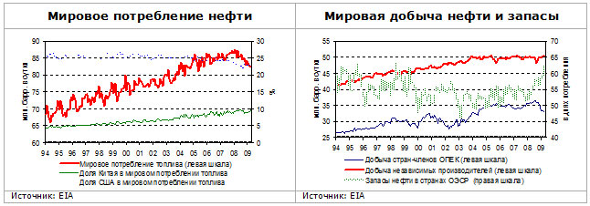 Пока же цены растут и связано это, помимо спекулятивного фактора, с некоторым оживлением спроса в Китае, второго по величине потребителя нефти в мире после США. Китай в апреле импортировал 16,7 млн. т (3,93 млн. барр. в сутки) , впервые за четыре месяца продемонстрировав рост (13,6%) год к году. Этот рост значим и по той причине, что в этот период прошлого года чрезвычайно высокий спрос на топливо был вызван подготовкой к летней Олимпиаде (эффект высокой базы). Растущий спрос на нефть в Китае, по всей видимости, вызван ростом промышленного производства (на 7,3% г/г) благодаря массивному «антикризисному пакету». Налоговые льготы привели к росту спроса на автомобили в Китае, что ведет к росту потребления топлива в стране. К тому же Китай продолжает формировать экстренные запасы нефти, которые к 2011 г. должны достигнуть трехмесячного объема импорта (сейчас их уровень в четыре раза меньше запланированного).