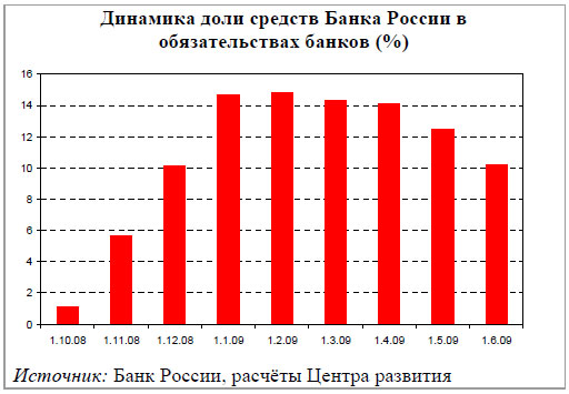 При реализации в настоящее время схемы вхождения государства в уставный капитал кредитных организаций в предполагаемом треугольнике Правительство – Центробанк – Коммерческие банки в выигрыше останутся только банки. Причём в весьма конкретном. В условиях, когда стоит вопрос о возможности или невозможности дальнейшего ведения бизнеса, у акционеров частных банков возникает естественное стремление получить как можно более дешевые деньги, не вкладывая при этом своих. Именно поэтому схема субординированных кредитов, предложенная прошлой осенью, и которая стоила 8% годовых (а теперь будет стоить 9,5%) не пользовалась особым успехом. Предполагаемая 3%-ная стоимость новой схемы для банков безусловно более выгодна. Будет ли это выгодно государству? Финансово – очевидно, нет, 3% годовых на вложенные средства слишком маленький доход для бюджета, который сегодня зарабатывает 12-13% на размещении своих депозитов в тех же банках. Может быть государство получит выгоду от последующей перепродажи своих пакетов акций? И здесь ответ скорее отрицательный. Не зря же в существующих условиях неопределённости нынешние акционеры банков не спешат увеличивать свои вложения. Это не хорошо и не плохо, это рационально, точно так же рационально с точки зрения частных банков желание получить государство в виде привелегированного, т.е. негослосующего акионера, оставляя всю полноту принятия решений в своих руках. Представляется, что для государства вхождение в капитал банка допустимо только в том случае, когда существует достаточная определённость в его жизнеспособности, что невозможно без расчистки баланса (которая данным законом не предусмотрена), а также общей стабилизации ситуации в экономике. До тех пор кредитная схема поддержки отдельных частных банков выглядит явно предпочтительнее1.