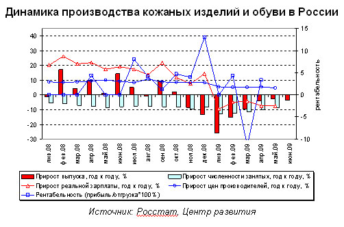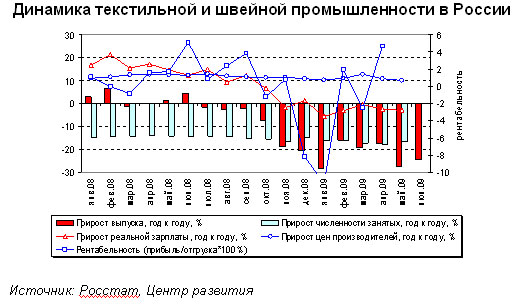 В целом легкая промышленность России, состоящая в нынешней терминологии из текстильной и швейной, а также кожевенно-обувной промышленности находится в перманентном кризисе уже давно, однако, парадоксальным образом длительная борьба за выживание и идущие уже несколько лет процессы сокращения численности занятых дают ей шанс удержаться на плаву. С начала 2006 г. численность занятых в текстильной и швейной промышленности сократилась на треть, в кожевенно-обувной – на 17%, что заметно выше 10%-го сокращения по промышленности в целом, и, следовательно, это приводит к более быстрому росту производительности труда и, возможно, конкурентоспособности отечественных производителей.