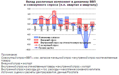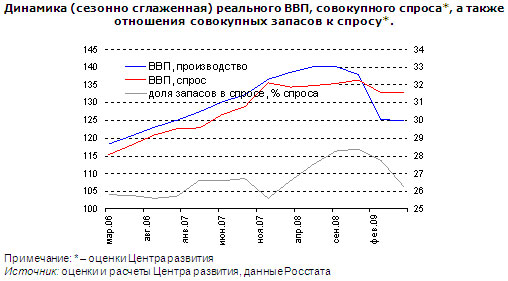 Сделанные Центром развития оценки динамики ВВП, совокупного спроса и их компонент показывают, что во втором квартале как ВВП, так и совокупный спрос стагнировали: сезонно сглаженные темпы роста ВВП относительно первого квартала составили -0,2%, а совокупного спроса +0,1%. Снижение запасов во втором квартале продолжалось более быстрыми темпами, чем в первом, что сократило отношение уровня запасов к совокупному спросу практически до докризисных значений (см. график). По нашему мнению, если уровень запасов в дальнейшем и будет снижаться, то весьма ненамного, т.е. влияние данного фактора на динамику ВВП исчерпано.