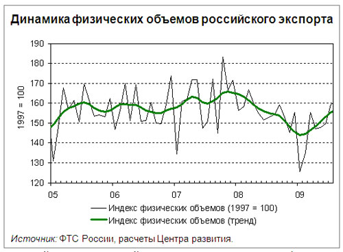Российский экспорт растет вслед за постепенным увеличением мирового спроса на сырьевые ресурсы. Индекс физических объемов экспорта, рассчитываемый Центром развития по ключевым товарам, вернулся на уровень июля прошлого года, однако, он пока еще остается на 13% ниже исторического максимума, зафиксированного в конце 2007 г. Если бы существующая динамика роста экспорта сохранилась (ежемесячный рост около 1,5%), то уже в начале следующего года российские экспортеры смогли бы поставить новый исторический рекорд, повторим, по физическим объемам. Однако мы уверены, что поддерживать такие темпы роста экспорта для российской экономики будет нереально, как в силу ограниченности экспортных мощностей, так и слабости мировой экономики.