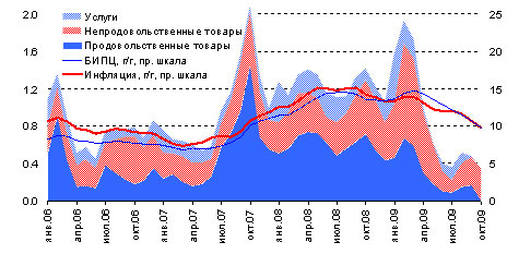 Динамика ИПЦ и БИПЦ, и вклад различных компонент в рост БИПЦ (2006-2009) п.п.