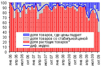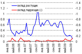 Из вышеприведенного графика хорошо видно, что единственной компонентой, поддерживающей базовую инфляцию на положительном уровне, остается динамика цен на непродовольственные товары, в то время как динамика цен на услуги и продовольственные товары продемонстрировала устойчивый тренд к снижению до нулевых значений2, и, возможно, даже перейдет в дефляцию. Так, в сентябре-октябре доля товаров, цены на которые продолжали расти, уменьшилась в два раза с 80% до 40%.