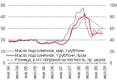 Для иллюстрации приведем данные о динамике мировых цен, цен производителей и розничных цен для подсолнечного масла. Из графика отлично видно, что розница сглаживает резкие изменения цен, но коррекция в сторону повышения цен происходит более интенсивно, чем в обратную, что формирует «подушку безопасности» для розничной торговли. По состоянию на начало осени размер такой подушки может быть оценен в 15-20%. Подобным образом дела обстоят по широкому спектру продовольственных товаров.