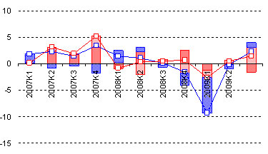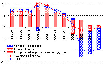 Не стоит удивляться низким темпам падения внутреннего спроса - по итогам третьего квартала их оцениваем в -1,4% к соответствующему периоду прошлого года – всё дело в том, что в прошлом году существенный прирост спроса имел место уже в кризисном четвертом квартале. Мы ожидаем, что уже в четвертом квартале масштаб падения внутреннего спроса может резко вырасти и составить порядка -5%. Одновременно следует ожидать заметного снижения темпов падения ВВП: так, стагнации ВВП в 4 квартале будет соответствовать падения на 7,4% г/г, а в 1-м квартале следующего года стагнации ВВП будет соответствовать уже его рост в размере 2-2,2% по отношению к первому кварталу 2009 г.