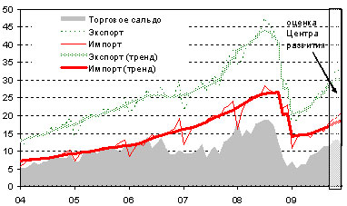 Вместе с тем и импорт продолжает свой устойчивый рост: его стоимость в октябре достигла 19 млрд. долл. Ежемесячный прирост импорта (по тренду) за период с июля по октябрь превышал 3%.