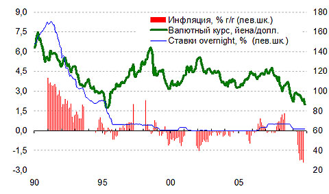 На фоне мирового финансового кризиса курс японской валюты вырос до уровня 86,4 иен за доллар, вплотную приблизившись к историческому максимуму апреля 1995 г. Укрепление иены заставляет японские компании снижать цены, чтобы конкурировать с импортными товарами - потребительские цены снижаются уже 9-й месяц подряд и к октябрю накопленная дефляция составила 2,5% по сравнению с тем же месяцем 2008 года. Столь сильной дефляции не наблюдалось даже в период 2002-2005 гг.