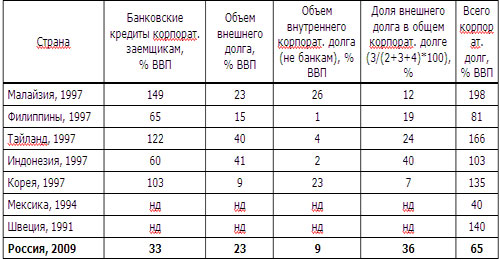 С одной стороны, величина совокупной долговой нагрузки на реальный сектор российской экономики по отношению к ВВП – 65% на конец 2009г. – относительно средней для кризисов прошлых лет почти в два раза меньше. С другой стороны, случай Мексики 1994 г. показывает, что и при меньшей, чем в России долговой нагрузке кризис возможен.