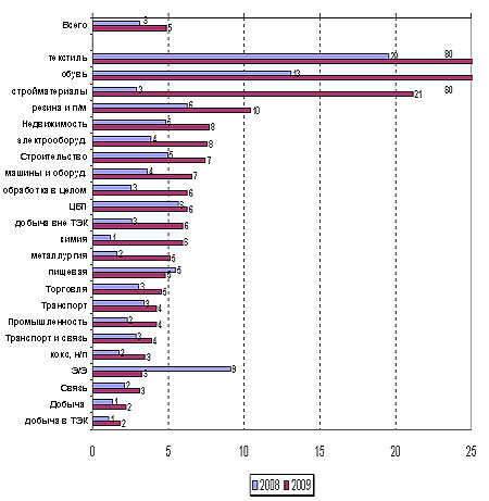 Кроме того, в российской экономике есть ряд секторов, где соотношение долга и внутренней задолженности за последний год резко ухудшилась. Наши расчеты показывают, что к таким секторам относится целый ряд обрабатывающих производств. Но если за перспективы экспортеров (химия, металлургия) можно не особенно беспокоиться – тут по крайней мере с денежными потоками всё в порядке, – то производители стройматериалов, машиностроители, бывший легпром, а также строители и девелоперы (См. рис. ниже) в прямом смысле слова находятся на грани банкротства.